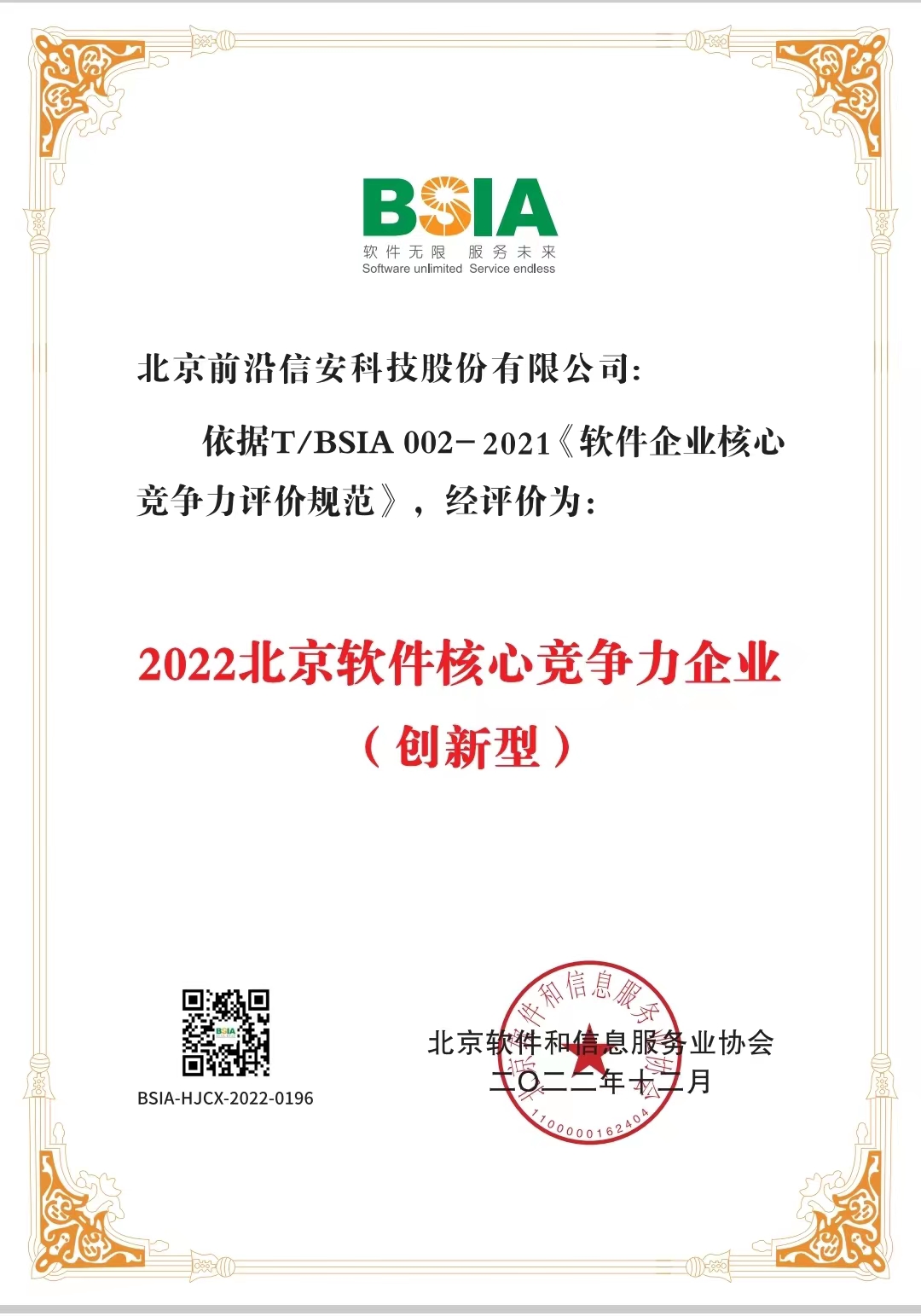 2022年12月,依据T/BSIA 002-2021《软件企业核心竞争力评价规范》B体育亚洲官方网站取得了2022北京软件核心竞争力企业(创新型)认定证书