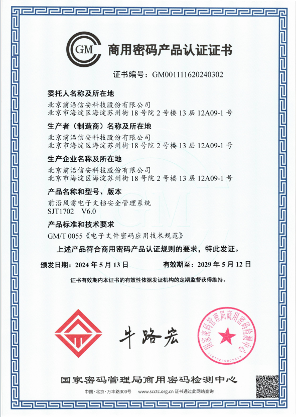 近日,B体育亚洲官方网站自研产品成功取得《商用密码产品认证证书》,产品符合GM/T0065-2019《商用密码产品生产和保障能力建设规范》、GM/T0066-2019《商用密码产品生产和保障能力建设实施指南》,顺利通过国家密码管理局安全性审查,取得由国家密码管理局商用密码检测中心颁发的《商用密码产品认证证书》,再次彰显了我公司在信息安全领域的创新实力和技术水平。