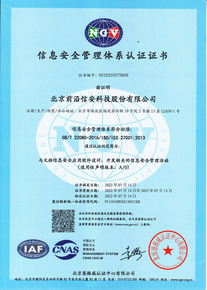 信息安全管理体系认证证书(GB/T 22080-2016/IS0/IEC 27001 : 2013)